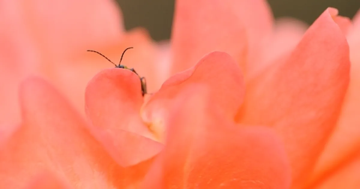 A HONEY BEE, resting in the folds of a rose, appears to be playing hide and seek with another insect. Those antennae belong to a spotted cucumber beetle. (Photo by Kathy Keatley Garvey)