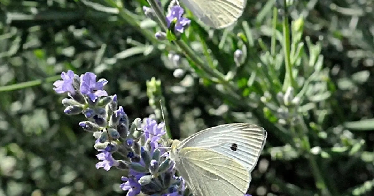 Two cabbage white butterflies, Pieris rapae, flutter over catmint in Vacaville, Calif. (Photo by Kathy Keatley Garvey)
