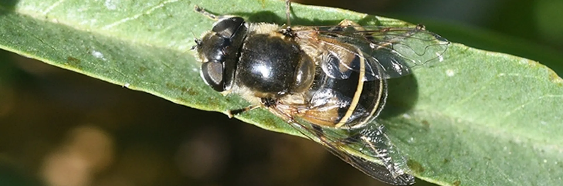 The UC Statewide Integrated Pest Management Program (UC IPM) has this to say about syprhids in its Natural Enemies Gallery post: "Adults are robust to slender flies 1/8 to 1 inch (4–25 mm) long, varying by species. The broad head is about the width of the abdomen or wider and has large eyes with distinct antennae. The body of many adults is black with bands or stripes of orange, yellow, or white, resembling stinging bees or wasps. Some species are mostly brown, metallic blue or green, yellow, or combinations of these or other colors. For example, adults of ant-predaceous Microdon species are blackish to brown or bright to dark greenish."