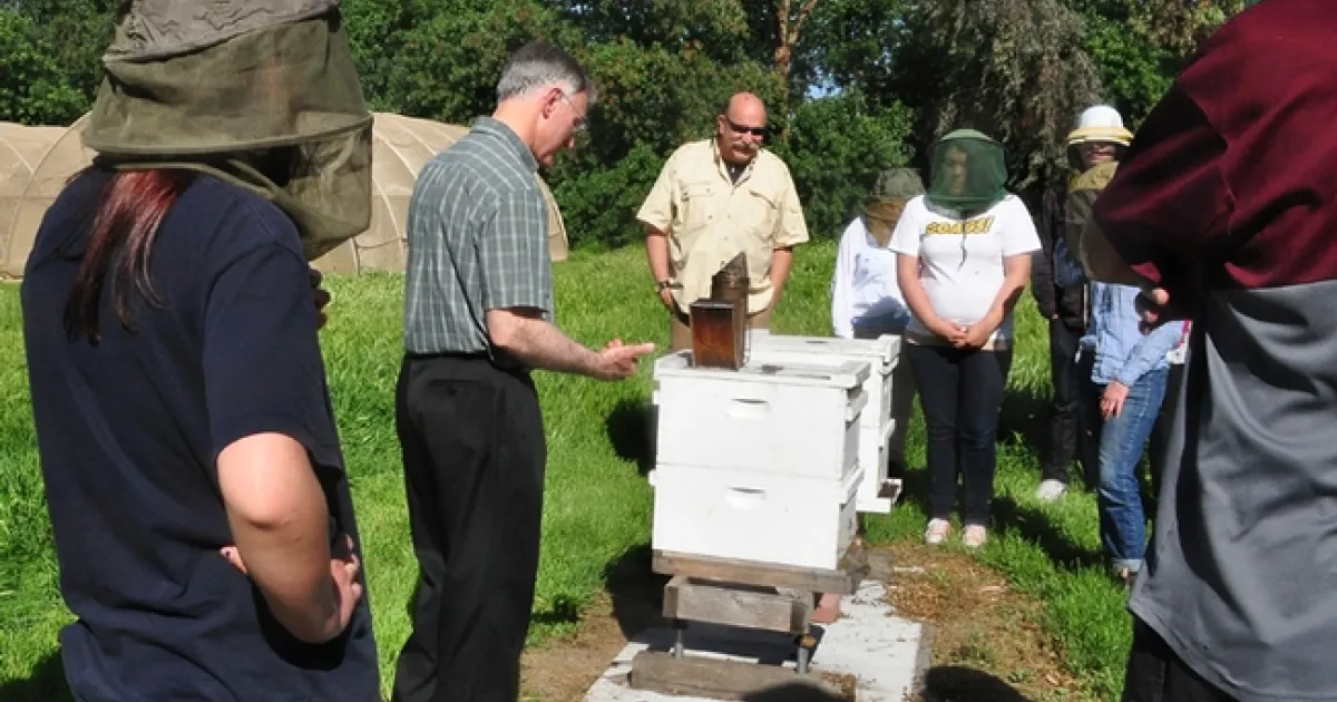 Extension apiculturist Eric Mussen (second from left) talks to a UC Davis class in the apiary of the Harry H. Laidlaw Jr. Honey Bee Research Facility. Third from left is forensic entomologist Robert Kimsey, one of the two class instructors.(Photo by Kathy Keatley Garvey)