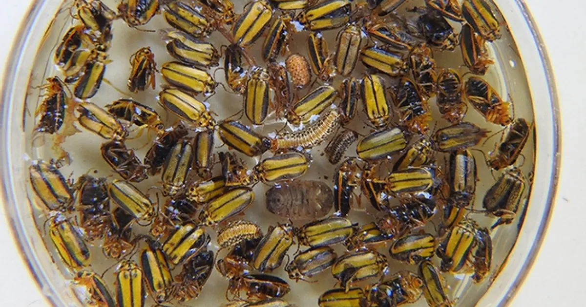 And if you look closer, you'll see the leaves--the feeding site--dropping prematurely, and beetles and their larvae falling with them.