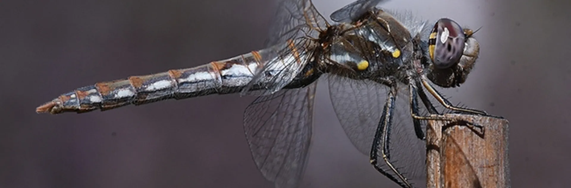As if on cue, a variegated meadowhawk dragonfly, Sympetrum corruptum, touched down on a bamboo stake, and looked right at me. I edged closer and "she" (gender identified by naturalist Greg Kareofelas, an associate with the Bohart Museum of Entomology, University of California, Davis) quickly left her perch.