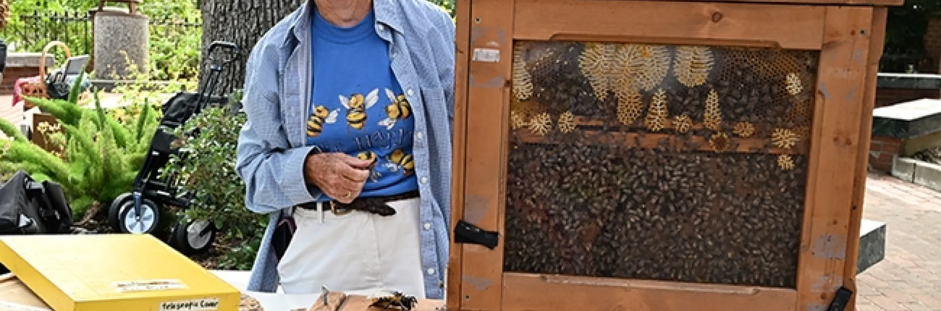 Ettmarie Peterson, known as "The Queen Bee of Sonoma County," stands by her bee observation hive at the Vacaville Museum Guild's Children's Party. (Photo by Kathy Keatley Garvey)
