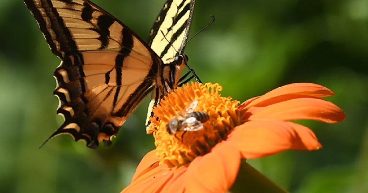 A honey bee foraging on a Mexican sunflower (Tithonia rotundifola) probably felt a slight breeze when a Western tiger swallowtail (Papilio rutulus) fluttered down and landed next to her.