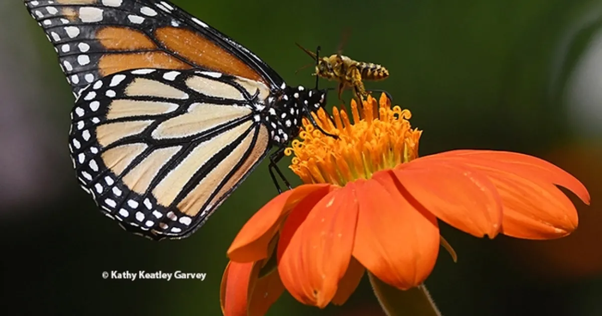 A territorial bee, a male Melissodes agilis, confronts a monarch butterfly in a Vacaville, Calif. pollinator garden. The prize relinquished: a Mexican sunflower, Tithonia rotundifola. (Photo by Kathy Keatley Garvey)