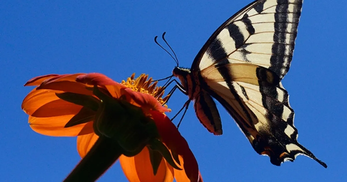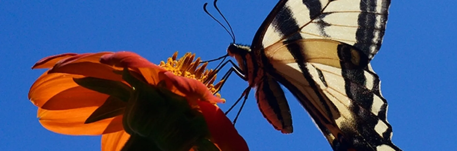 Such was the case when we spotted a Western tiger swallowtail, Papilio rutulus, foraging for nectar on a Mexican sunflower, Tithonia rotundifola, in a Vacaville garden.