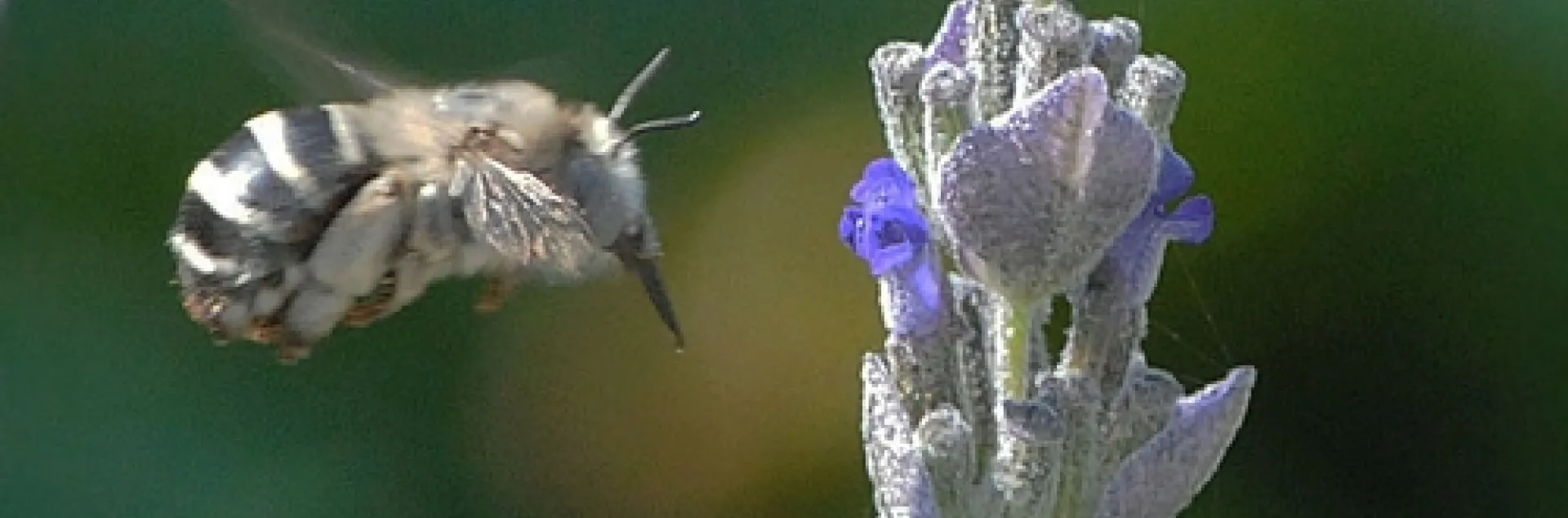 WITH TONGUE EXTENDED, Anthophora urbana heads for lavender. It's known as a rapid forager. (Photo by Kathy Keatley Garvey)
