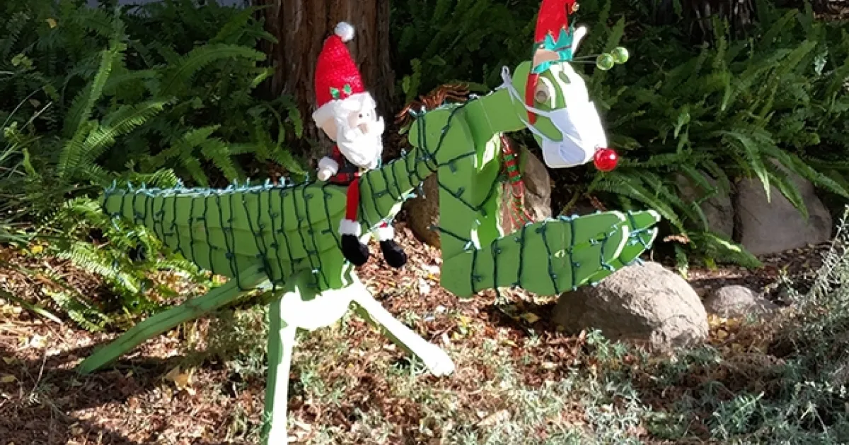 Giddy-up! Santa, being the jolly ol' gent he is, drives The Red-Nosed Mantis in front of the Davis home of entomologists Robert and Lynn Kimsey of the UC Davis Department of Entomology and Nematology. (Photo by Lynn Kimsey)