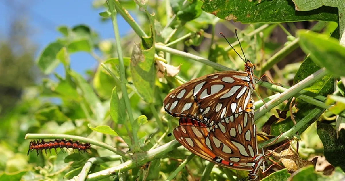 UC Davis distinguished professor Bruce Hammock's noted research on chronic pain all began at UC Berkeley when he wondered how caterpillars turn into butterflies. In this photo: two Gulf Fritillary butterfly mating, while a caterpillar munches passionflower leaves in the background. (Photo by Kathy Keatley Garvey)