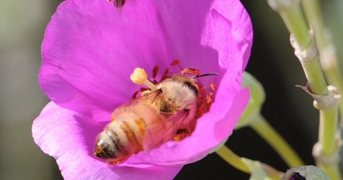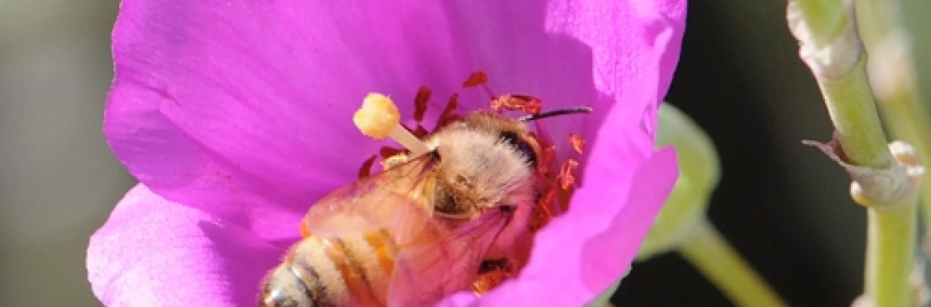 We took this photo of a honey bee on a rock purslane (Calandrinia grandiflora) blossom.