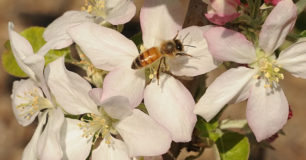 This photo of a honey bee on an almond blossom will appear on the WAS conference t-shirt. (Photo by Kathy Keatley Garvey)
