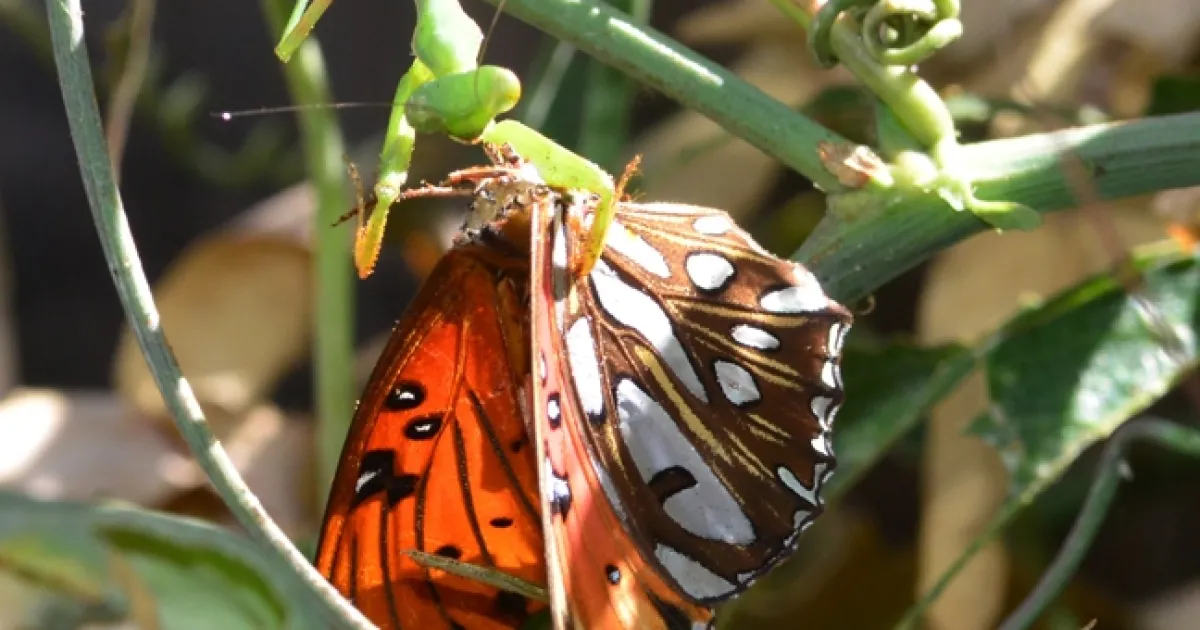 A cunning praying mantis, camouflaged as a green stem, snared it, grasping it in its spiked forelegs. Then it did one praying mantids do. It bit off its head and proceeded to eat it.