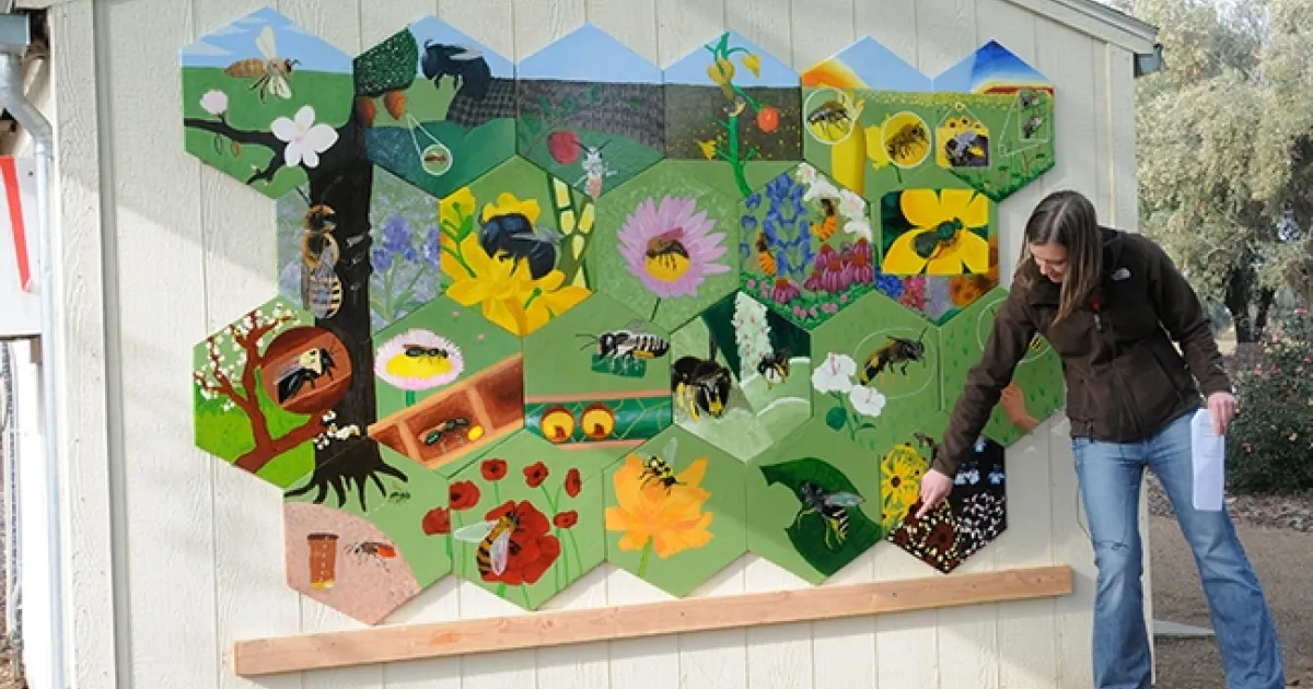 Another project, supervised by Ullman and Billick in 2011 and coordinated by then doctoral student Sarah Dalrymple of the Rick Karban lab, features a mural of mostly native bees on the garden shed.