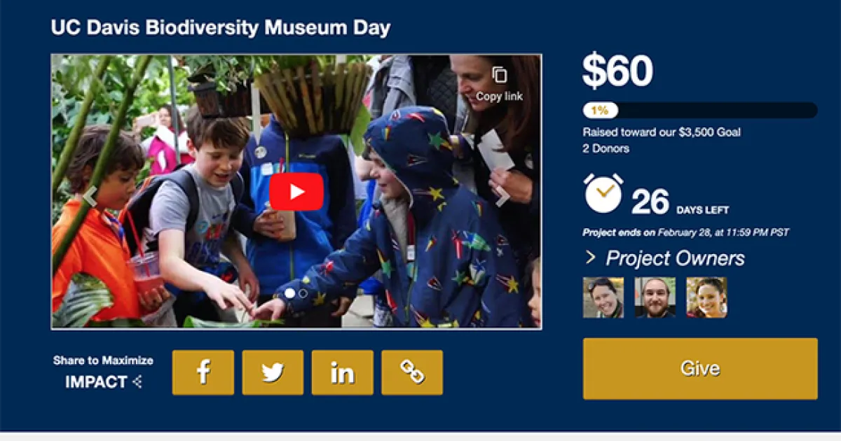 Organizers of the crowdfunding are Tabatha Yang, education and outreach coordinator for the Bohart Museum of Entomology who is chairing the Biodiversity Museum Day; Brennen Dyer, Bohart Museum collections manager; and Melissa Cruz Hernandez, outreach and leadership program manager, UC Davis Arboretum and Public Garden.