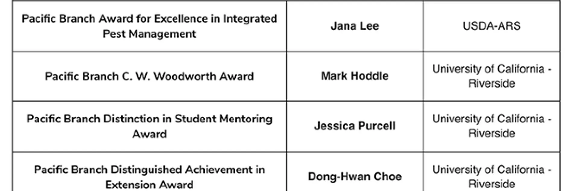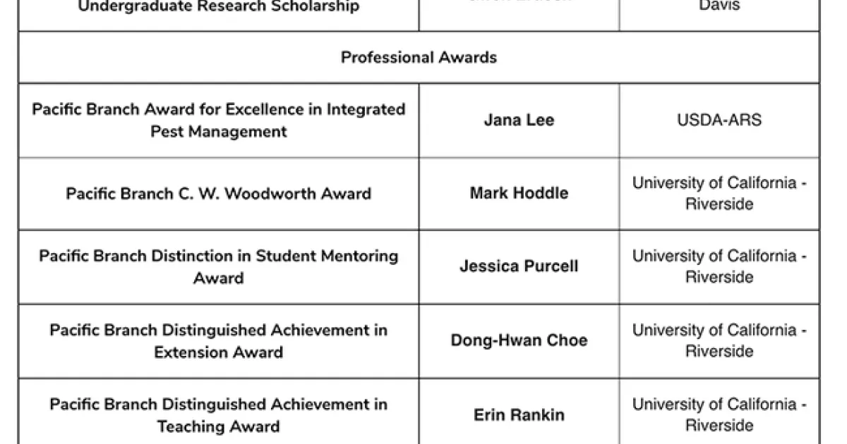 Results showed UC entomologists (from the two campuses) winning a total of eight awards, and USDA, four. (See the chart below) Congratulations, all!