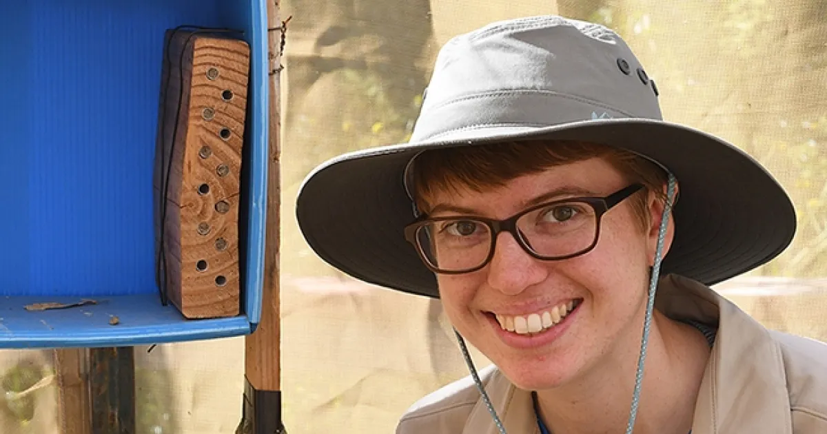 UC Davis doctoral student Clara Stuligross by her blue orchard bee nests in the spring of 2018. (Photo by Kathy Keatley Garvey)