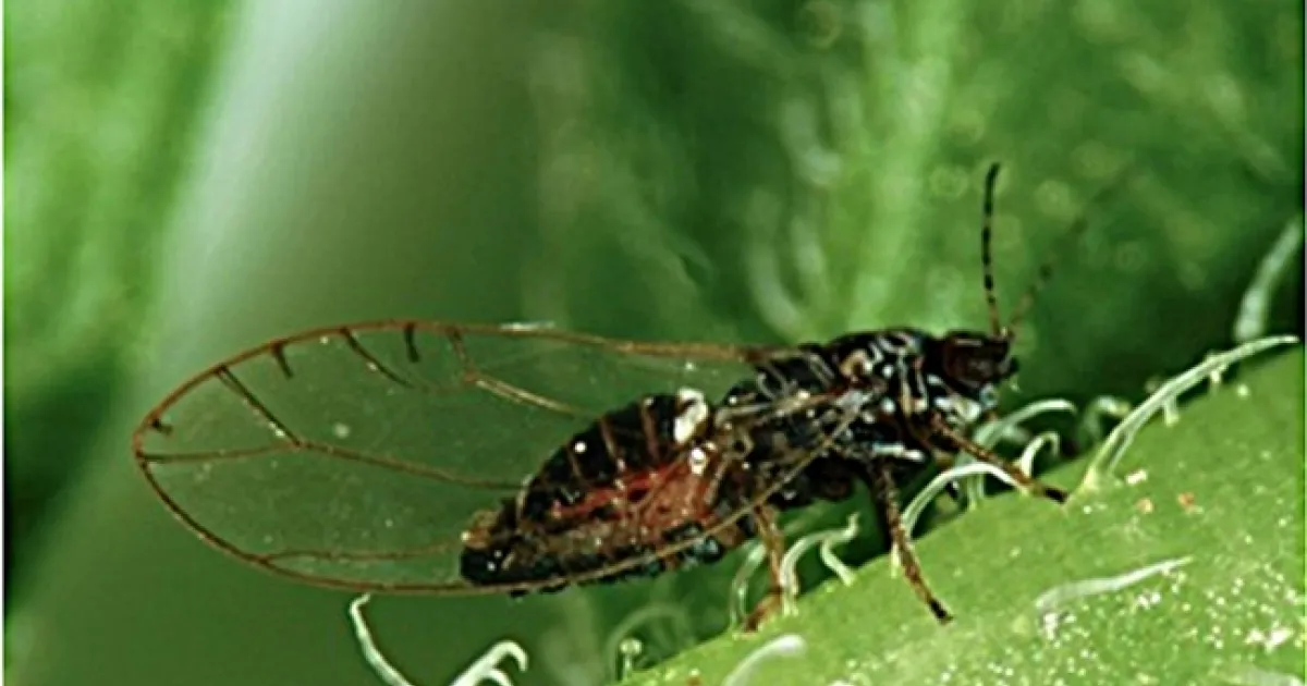 UC IPM describes the pest as looking like a "small cicada, about 0.08 inch (2 mm) long" and related to aphids and leafhoppers. "The adult has clear wings that rest rooflike over the body," UC IPM says. "Although predominantly black, the potato psyllid does possess white markings. The first abdominal segment shows a broad white band, the last segment has an inverted white 'V.' Psyllids jump quite readily when disturbed."