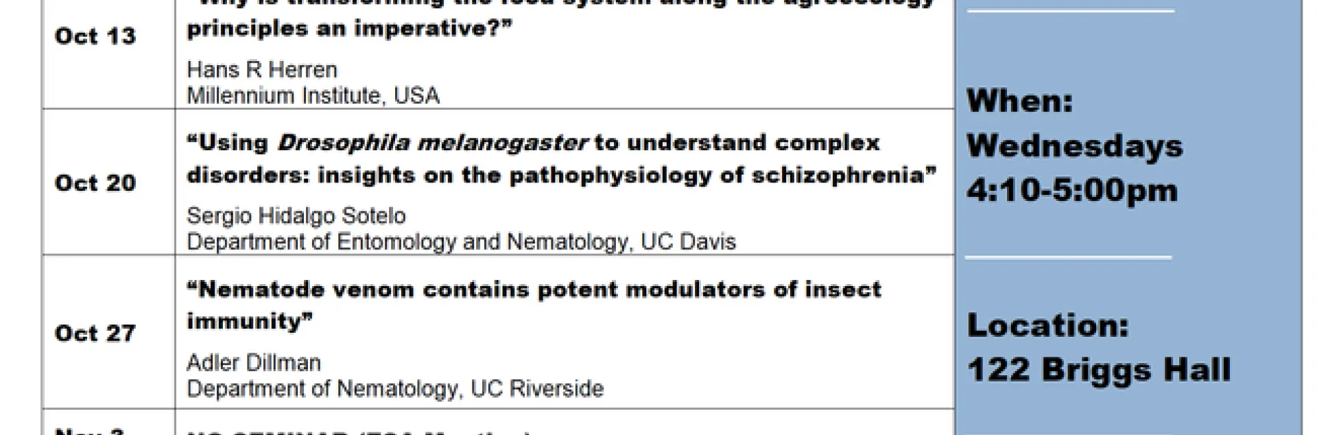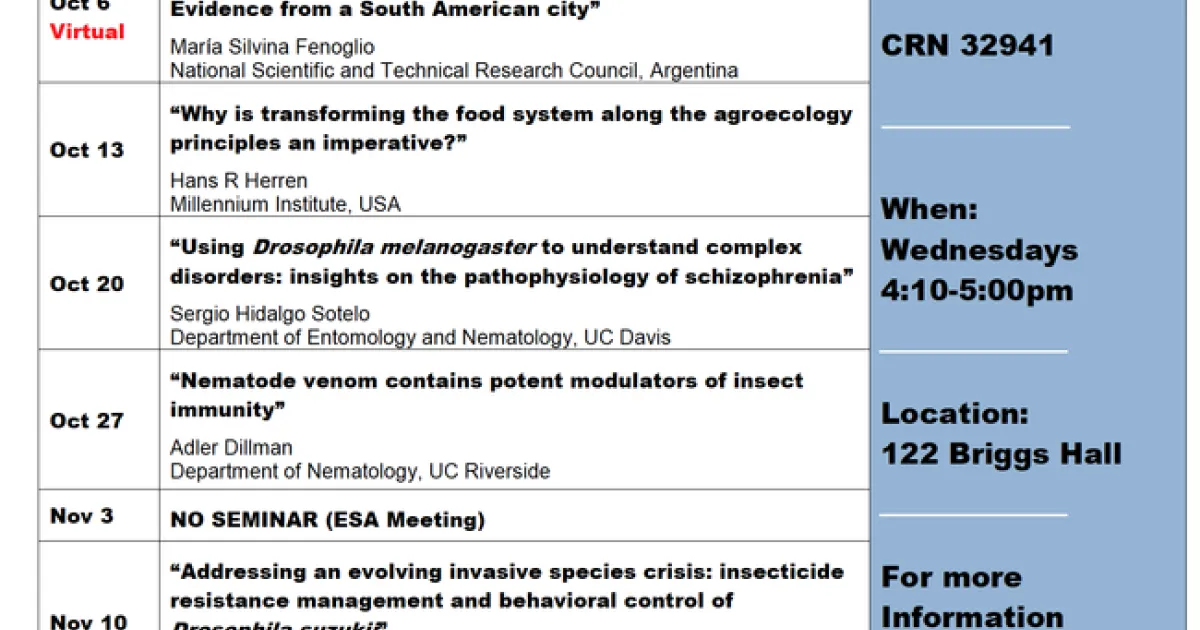 A fantastic line-up awaits those eager to attend the UC Davis Department of Entomology and Nematology's in-person and virtual seminars. Topics include earwigs, green roofs, fruit flies and nematodes.