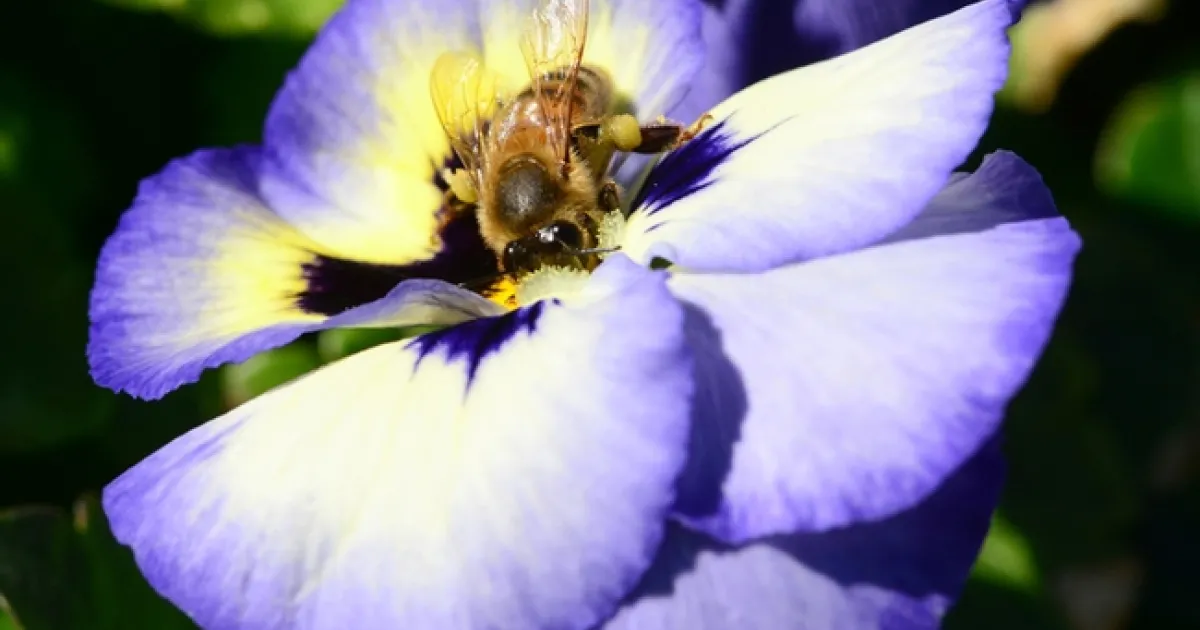 A honey bee foraging on a pansy. (Photo by Kathy Keatley Garvey)