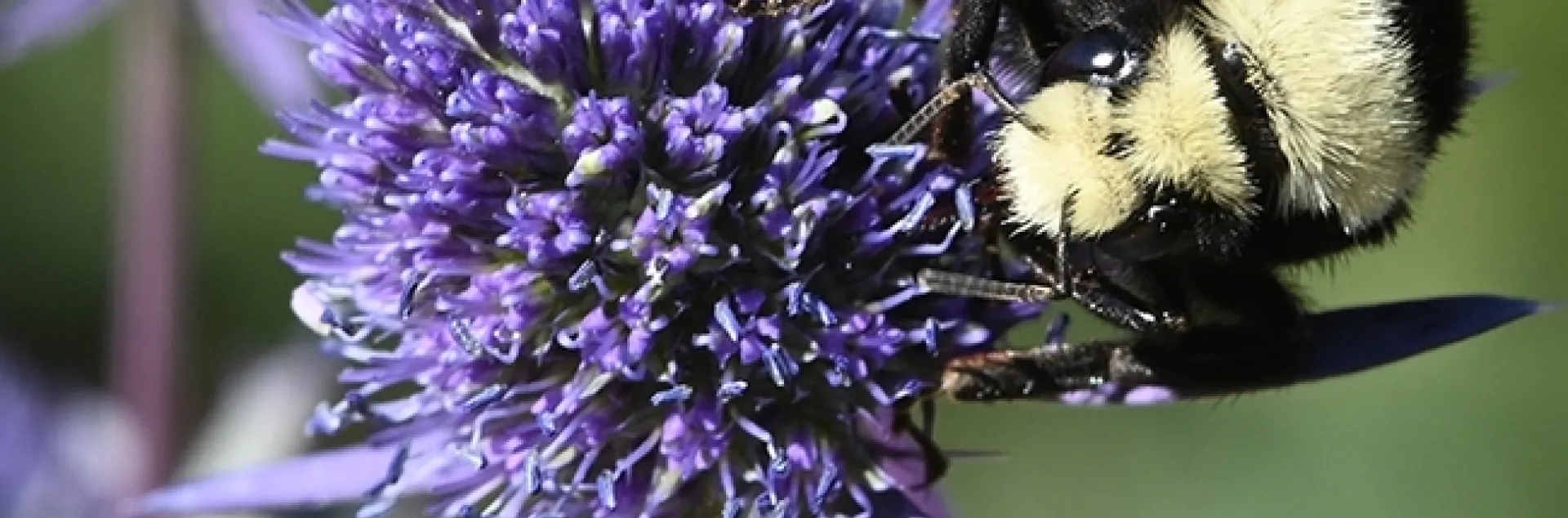 A yellow-faced bumble bee, Bombus vosnesenskii, sipping nectar from an Amethyst Sea Holly, Eryngium amethystinum, in Sonoma. (Photo by Kathy Keatley Garvey)