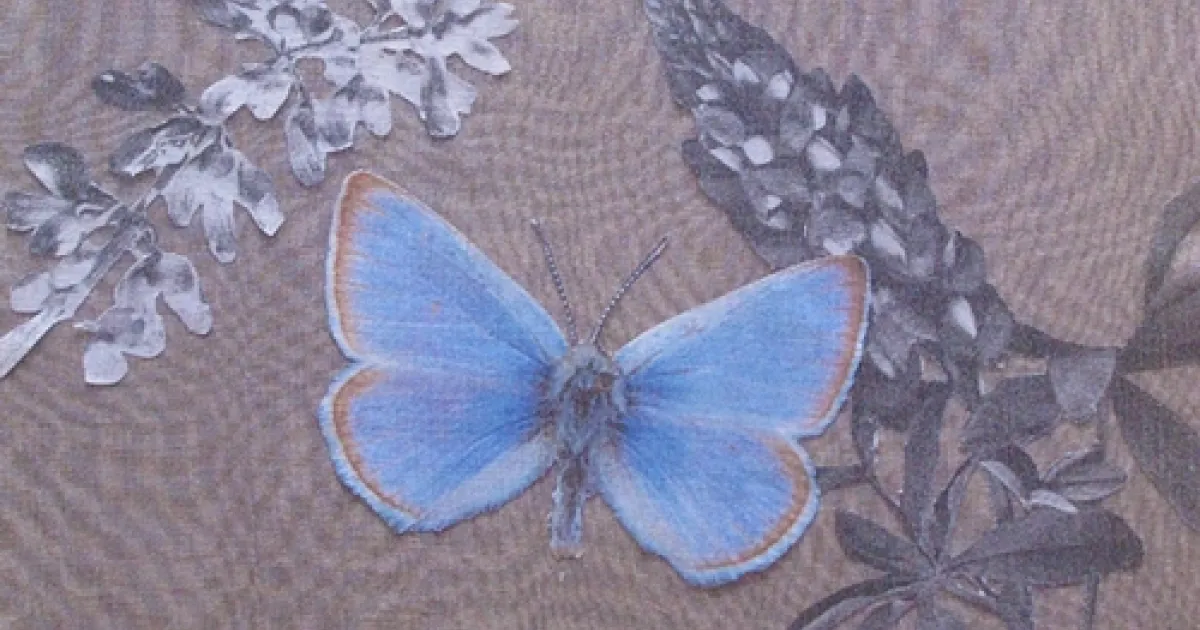 THIS PIECE, "Disappearing Mission Blue," by visual artist Carol Newborg of the San Francisco Bay Area is one of the ecoart works displayed this weekend in the Marin Civic Center Auditorium and Exhibit Hall, San Rafael. Entrance to the show, which continues through Sunday, is free.