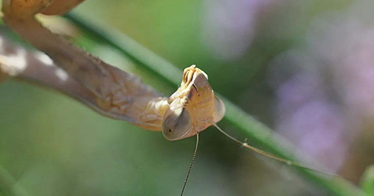 A female praying mantis is perched upside down in our pollinator garden. She has maintained this position in the verbena over a four-day period, enduring temperatures that soar to 105 degrees.