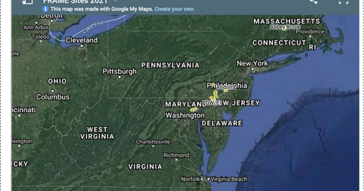 From the website: "Our current work includes experimental and observational studies of soil and key species to understand interactions between plants, invertebrates, and vertebrates. Other research is focused on monitoring, manipulations aimed directly at site improvement, and technology transfer for better management of urban forest fragments. As of 2022, there are 60 FRAME sites in MA, PA, DE, MD and NC."