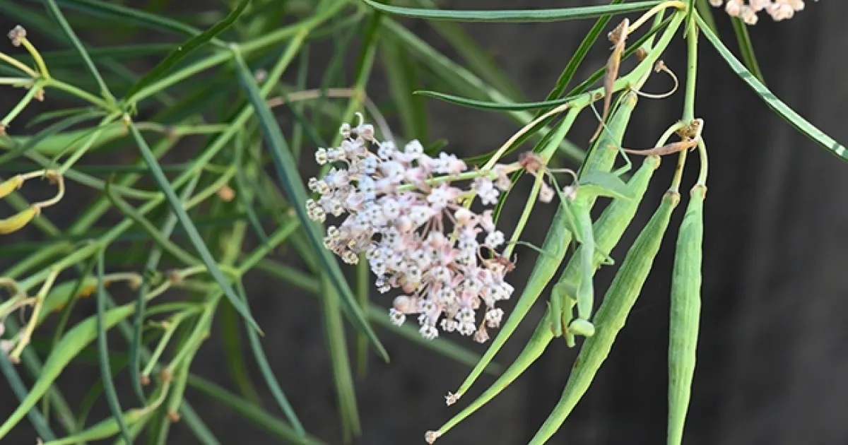 A praying mantis is camouflaged amid the green stems, seed pods and leaves of a native milkweed as she awaits prey. (Photo by Kathy Keatley Garvey)