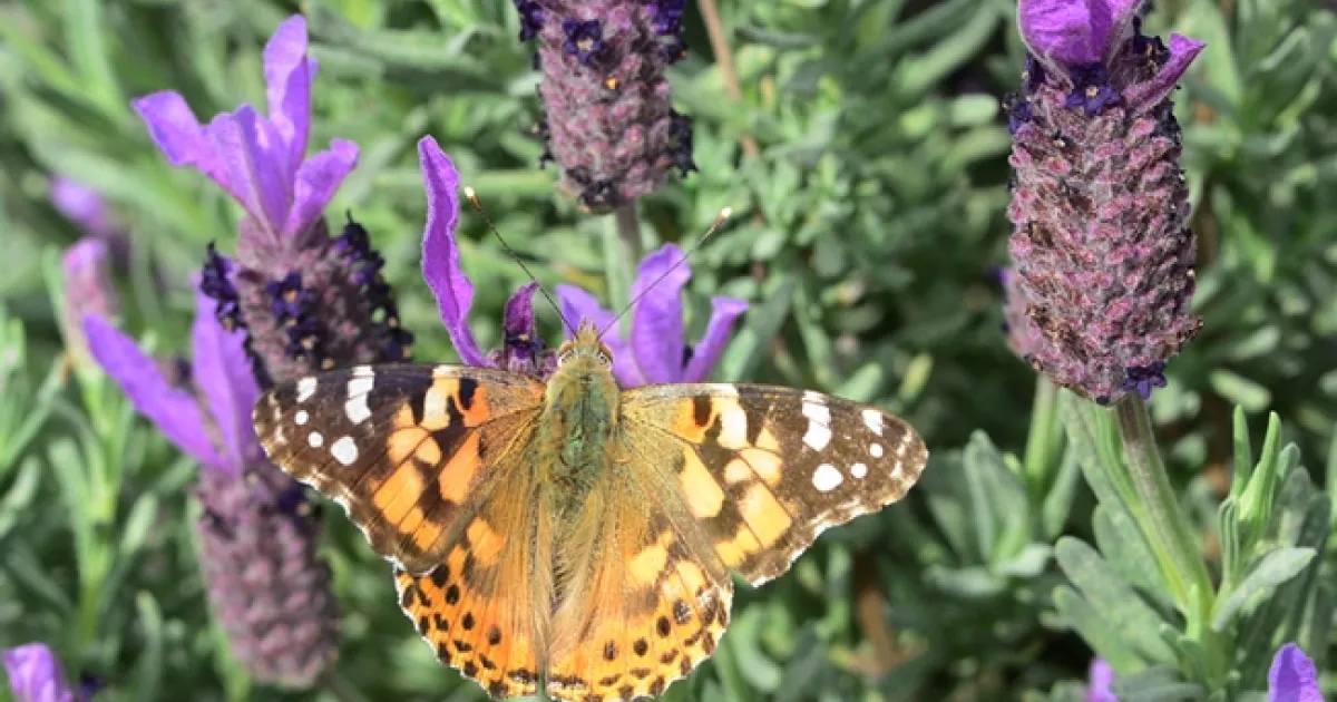 A female butterfly, a painted lady, nectaring on Spanish lavender on March 8 in the Benicia Community Garden. (Photo by Kathy Keatley Garvey)