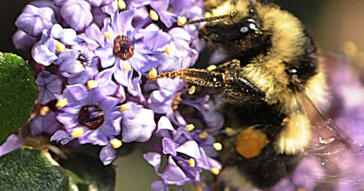 Initially, Thorp suspected that the pollen load came from the nearby almond trees. "On closer inspection, the pollen loads look more yellow, so they may be from Ceanothus, but they seem a bit darker than what the honey bees foraging on Ceanothus are carrying," he said. "This could be to the difference in nectar added by the different bees to moisten the pollen pellets."