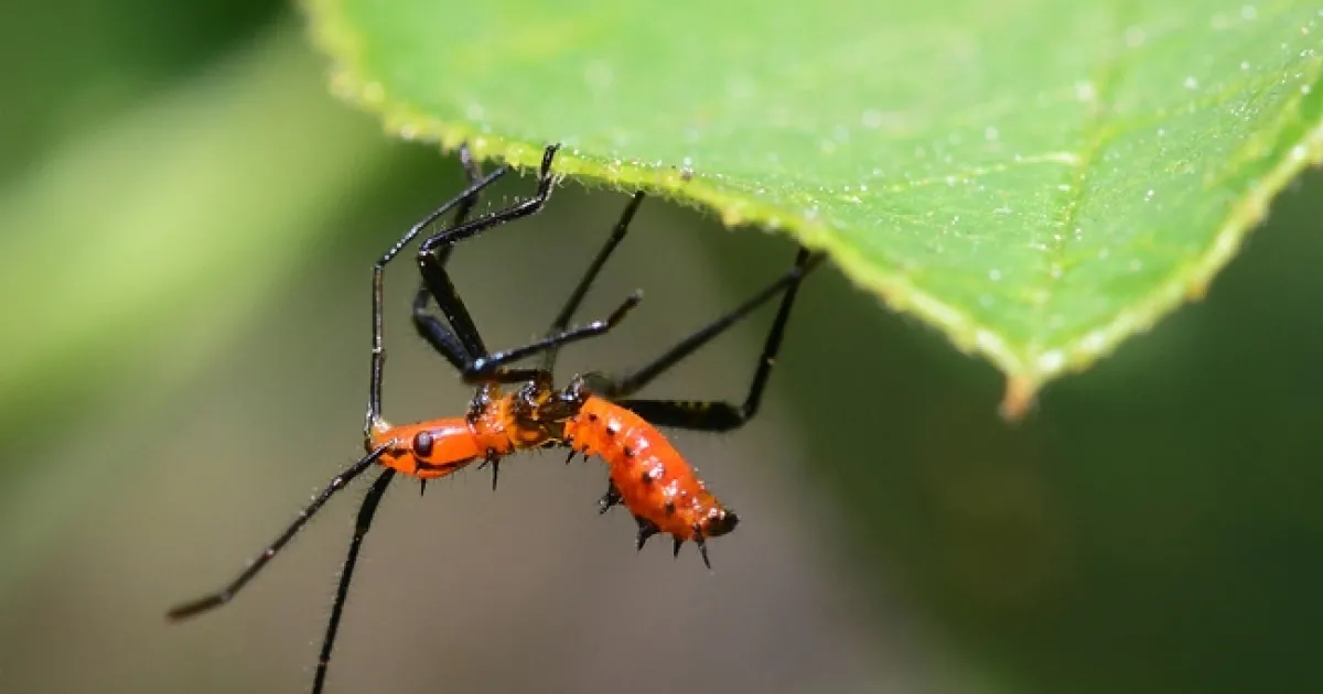 Close-up of a Gulf Fritillary caterpillar. These leaffooted bug nymphs are sharing leaves of the Passiflora with Gulf Fritillary caterpillars. (Photo by Kathy Keatley Garvey)