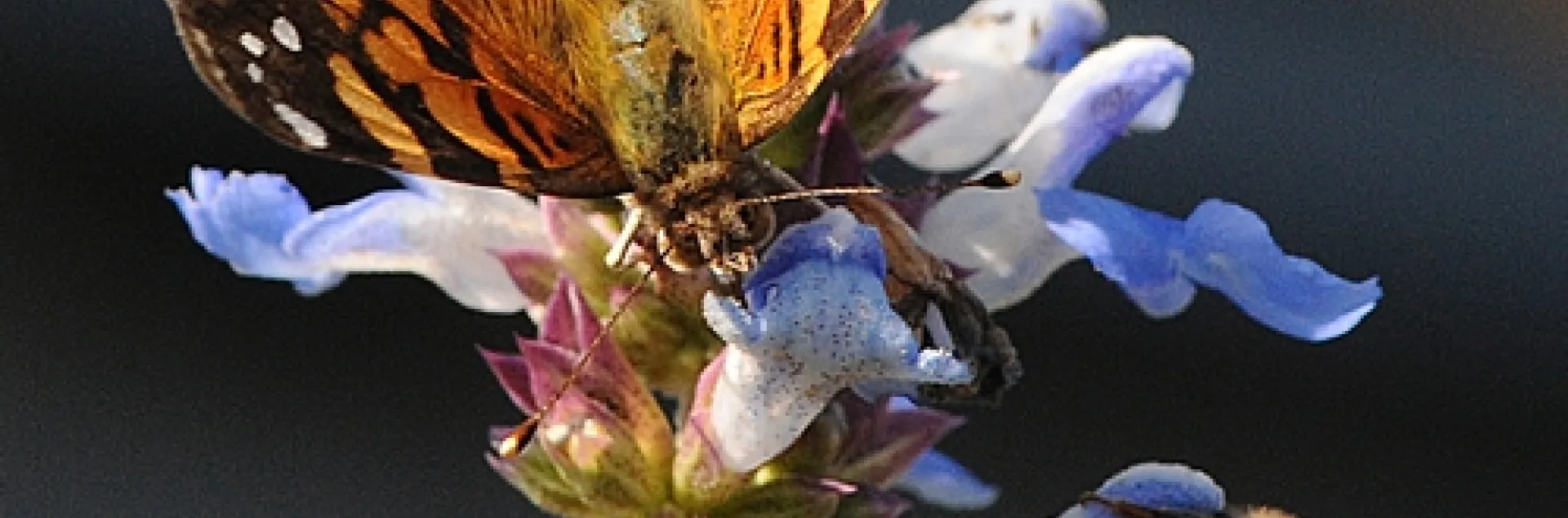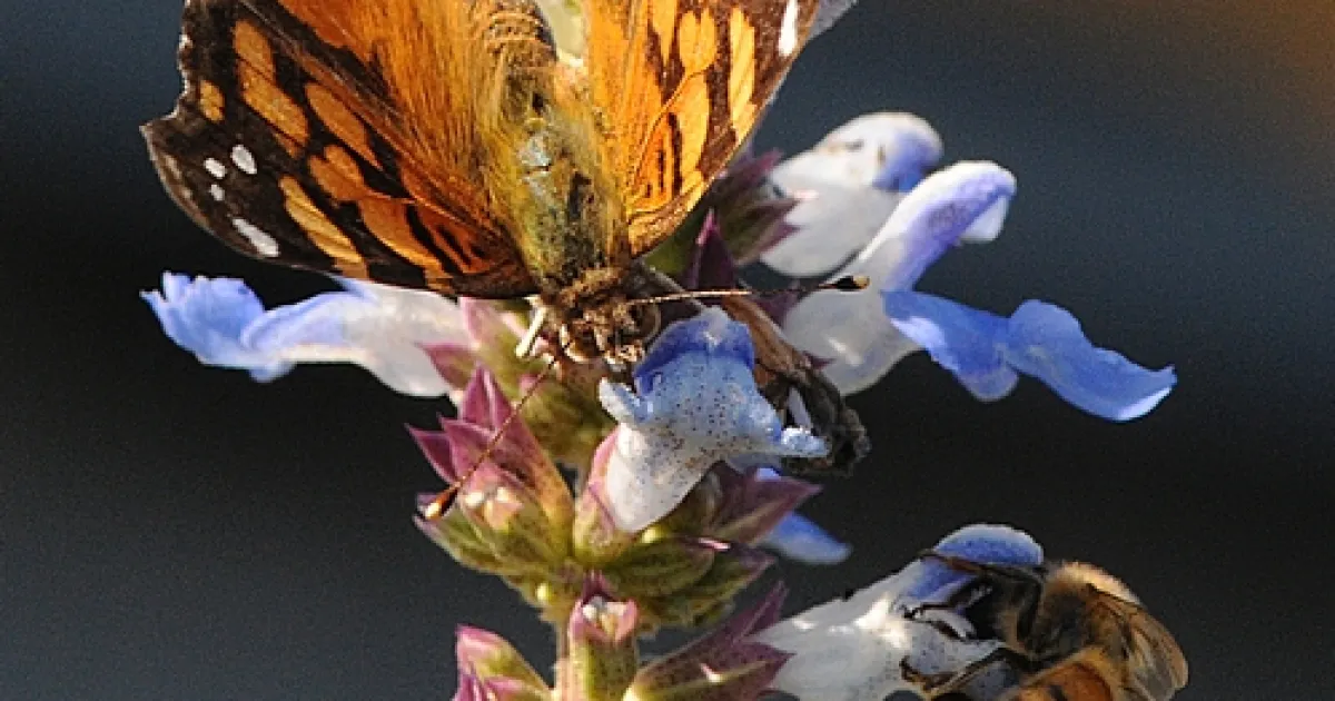 The wings of the orange-brown butterfly and the transparent wings of the honey bee glowed in the sunlight as the insects nectared the sky-blue blossoms. The two have at least one thing in common: they love a good sage.