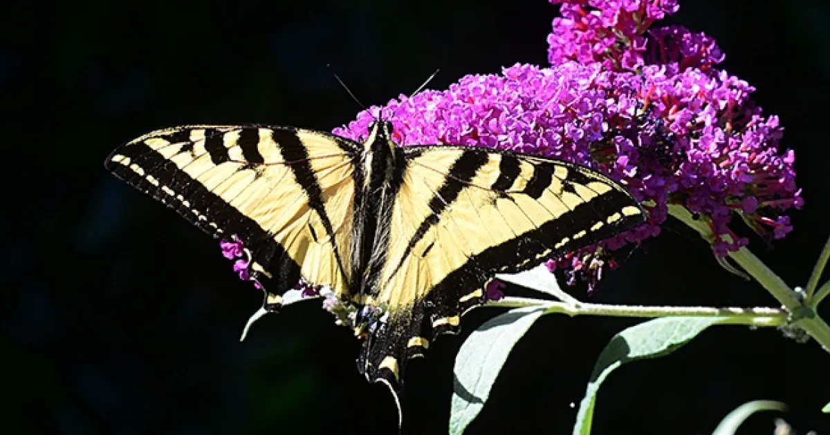 The Western tiger swallowtail, Papilio rutulus, a showpiece throughout western North America, populates urban parks and gardens. In color, it's a striking yellow and black, with spots of blue and orange near its tail. Its magnificent wingspan can measure 3 to 4 inches.