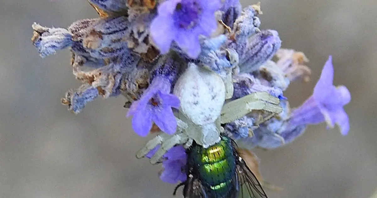A crab spider, camouflaged in our lavender patch, didn't catch a honey bee, a butterfly, an ant or a syrphid fly.