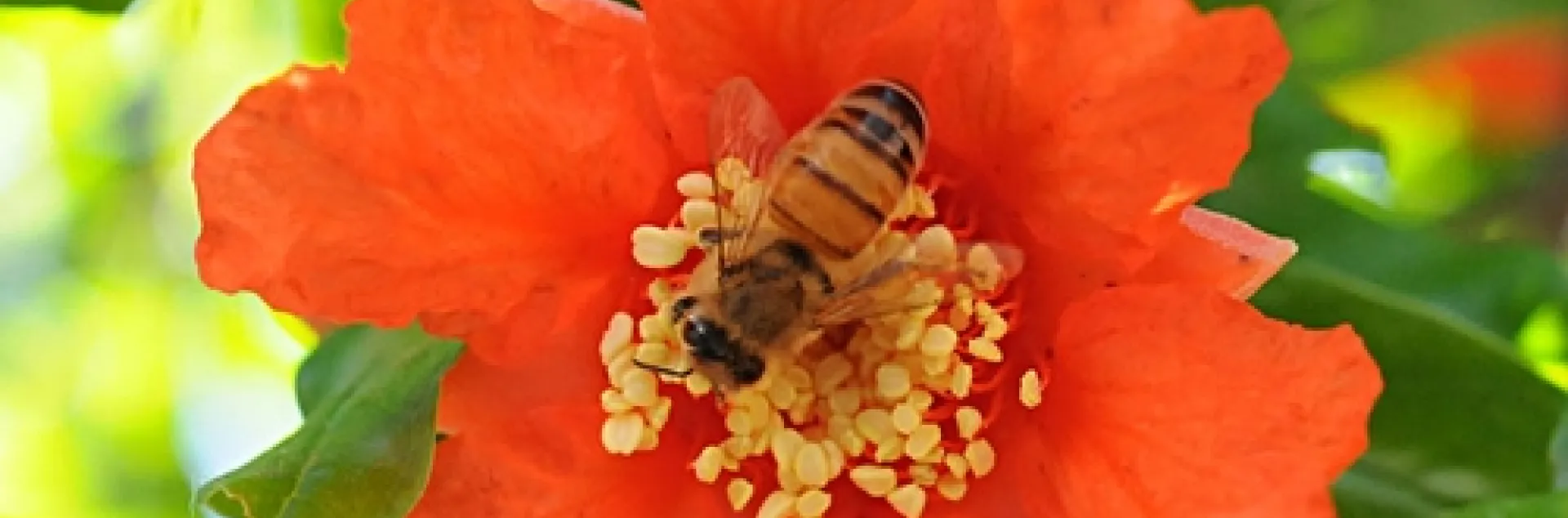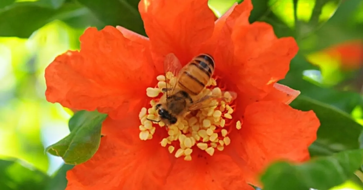 POM TIME--A honey bee nectars a pomegranate blossom. (Photo by Kathy Keatley Garvey)