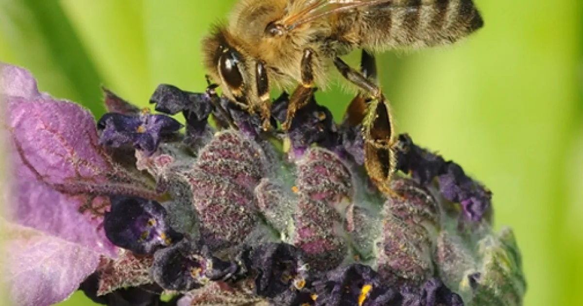 A honey bee necatring on lavender. (Photo by Kathy Keatley Garvey)