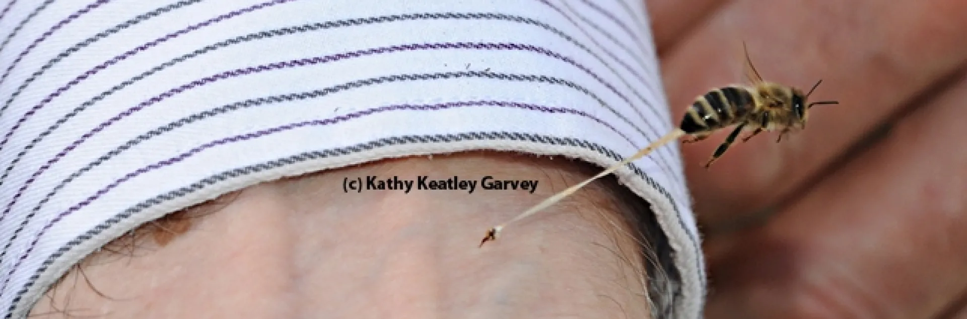 Take the case of "The Sting," a memorable lunch-hour photo that went viral. Extension apiculturist Eric Mussen and I were walking through the apiary of the Harry H. Laidlaw Jr. Honey Bee Research Facility, UC Davis, when he stopped abruptly. "Kathy, get your camera ready," he said. "A bee is about to sting me."