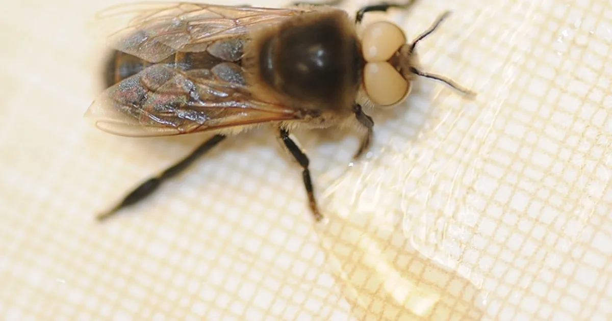But, back to the white-eyed drone. Like other drones, he will be fed by his sisters, the worker bees. No reproduction for him, though. No gathering in the drone congregation area. No waiting for a queen.