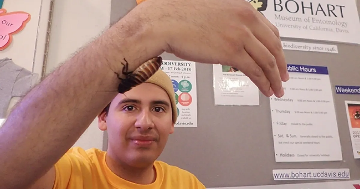 - UC Davis student Diego Rivera showing Madagascar hissing cockroaches.