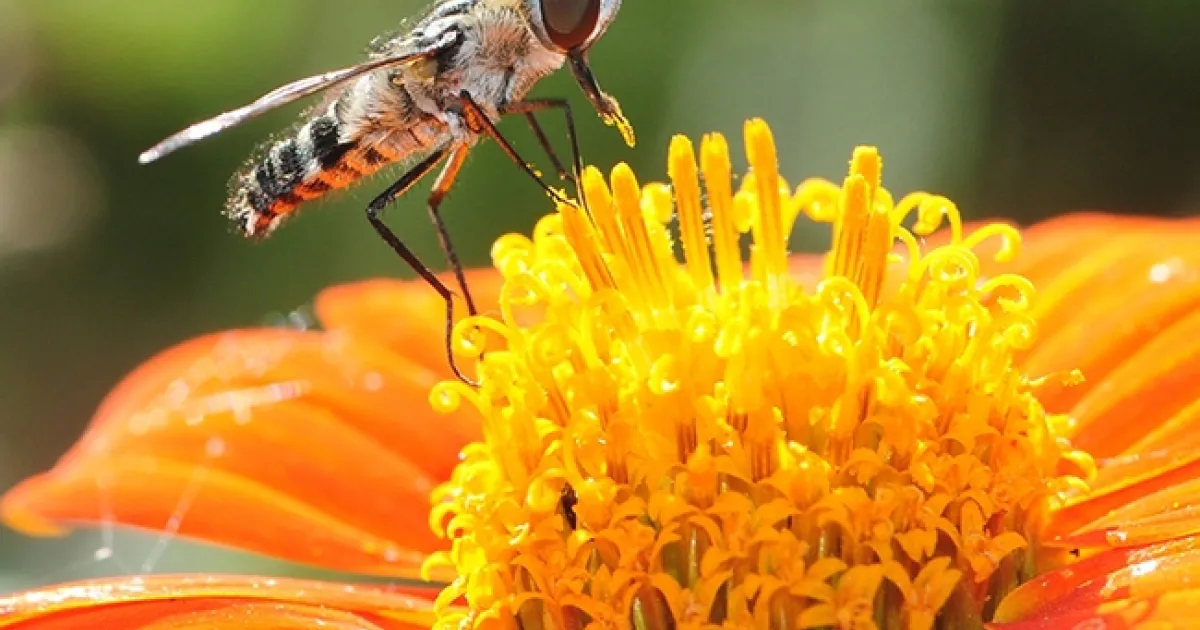 Here's proof positive that flies can pollinate. If you look closely at this little bee fly on a Mexican sunflower (Tithonia), you'll see that it has just grabbed some pollen. It's a member of the genus, Villa, and family, Bombyliidae, according to fly expert Martin Hauser of the California Department of Food and Agriculture.
