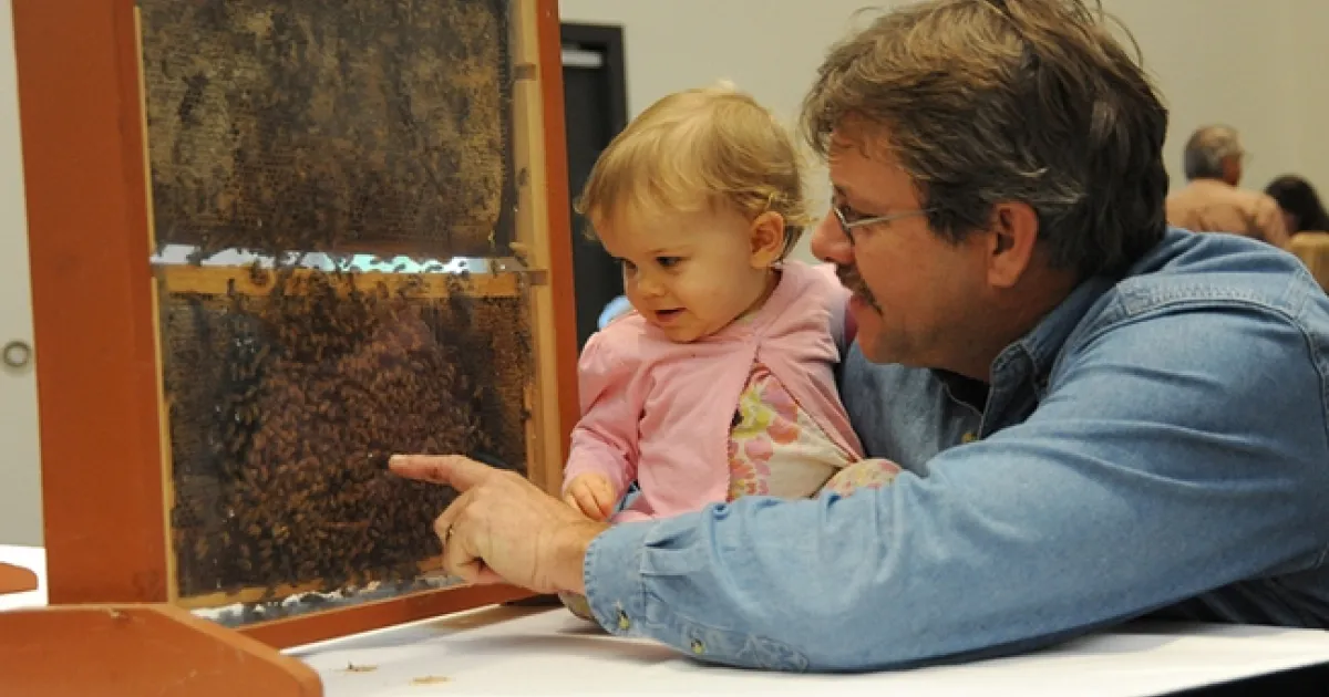Brian Fishback shows his daughter, Emily, a bee observation hive. (Photo by Kathy Keatley Garvey)