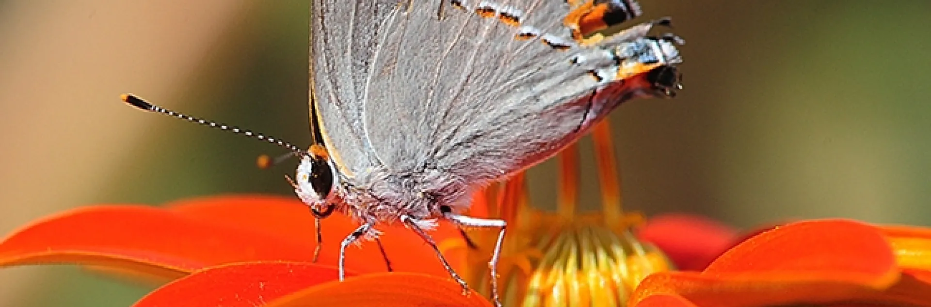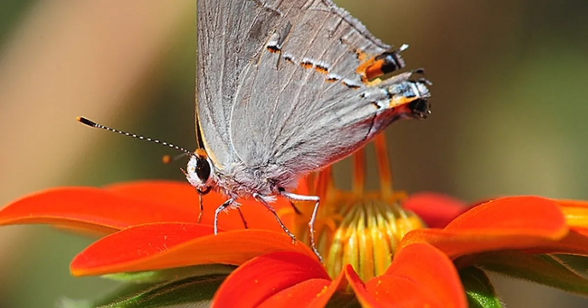 We're talking about the gray hairstreak, a common gray butterfly found throughout the United States, coast to coast, as well as parts of Canada and Mexico. Entomologists describe Strymon melinus as a small gray butterfly with a wingspan of from 2.6 to 3.65 centimeters. It is distinguished by its black-eyed orange spot at the base of its hindwing tails. It also has a small patch of blue before the tail, and two broken crossbands of black and white spots.