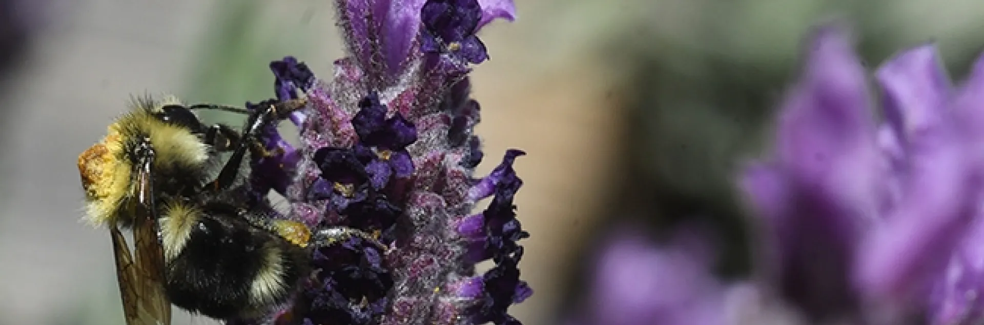 The bumble bee, Bombus melanopygus, was foraging in our Spanish lavender last weekend when we noticed something unusual: a sort of hump on the back, a reddish coloration.