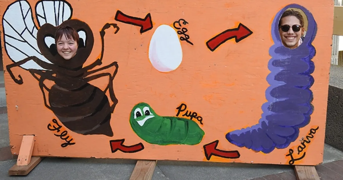 Jordan King, a UC Davis student majoring in mechanical engineering, and Noel Bresson, an art and history major, stepped right up. Jordan became a larva, and Noel, a fly.