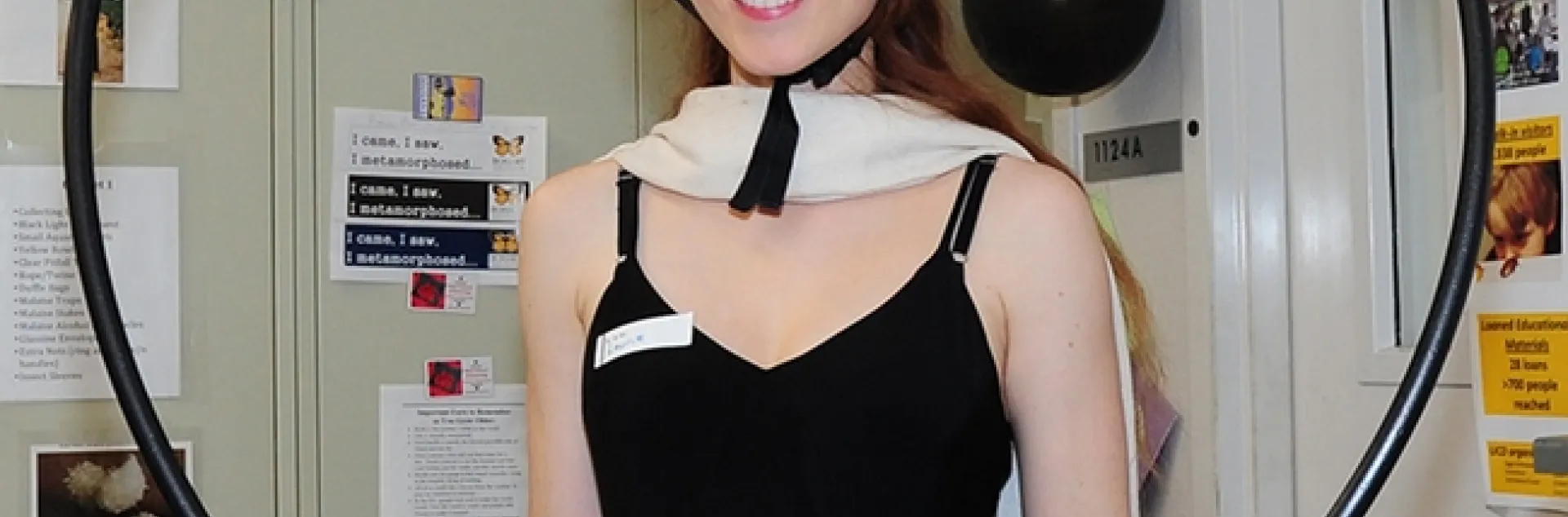 UC Davis entomology undergraduate student Laurie Casebier crafted the cerambycidae beetle (long-horned beetle) costume. "I used my bike helmet and cut a hula hoop in half and attached the ends to my helmet to make the long antenna and used duct tape to make the familiar notched eyes," she said. "Then I cut out paper and my pseudotetramerous tarsi. I used a scarf as elytra. It was kind of modeled after the apple borer, but not really."