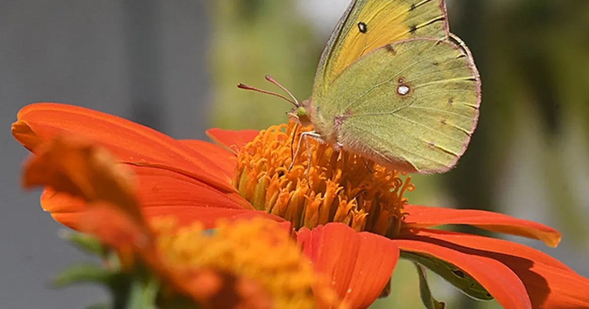 An alfalfa or sulfur butterfly (Colias eurytheme) fluttered into our pollinator garden in Vacaville to sip some nectar from a Mexican sunflower (Tithonia rotundifolia). It lingered for several minutes.