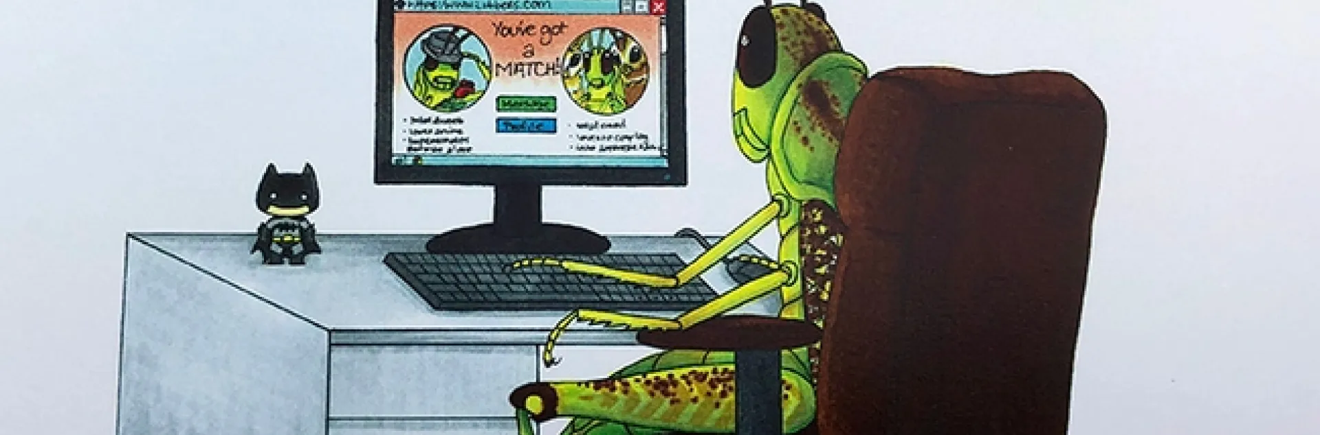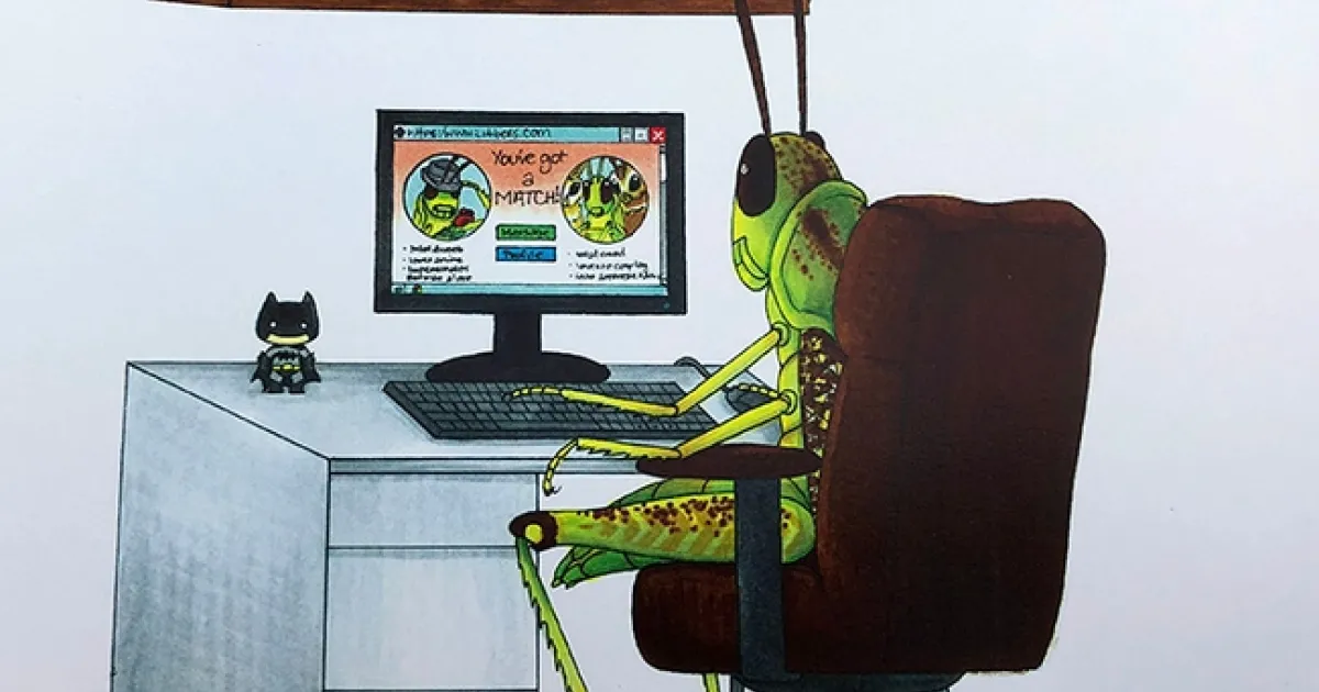 "Mr. January" is a locust sitting quite comfortably in a chair--a swivel chair at that--and eagerly accessing a dating site. "You've got a match!" the screen informs him.