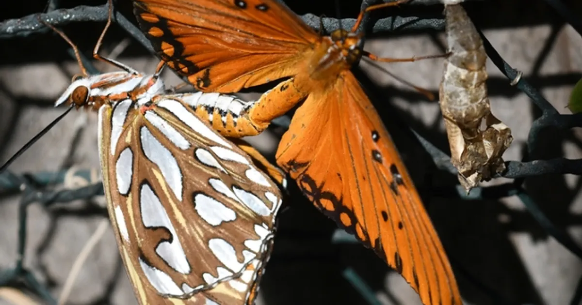 There! A Gulf Fritillary has just emerged from her chrysalis on the passionflower vine, and a suitor descends within minutes. He doesn't use any pick-up lines. He doesn't have to. In seconds, there's a twosome on the passionflower vine, something apparently rarely seen. (The Bohart Museum of Entomology, UC Davis, answers telephone calls from folks who excitedly proclaim they've found a "two-headed butterfly.")
