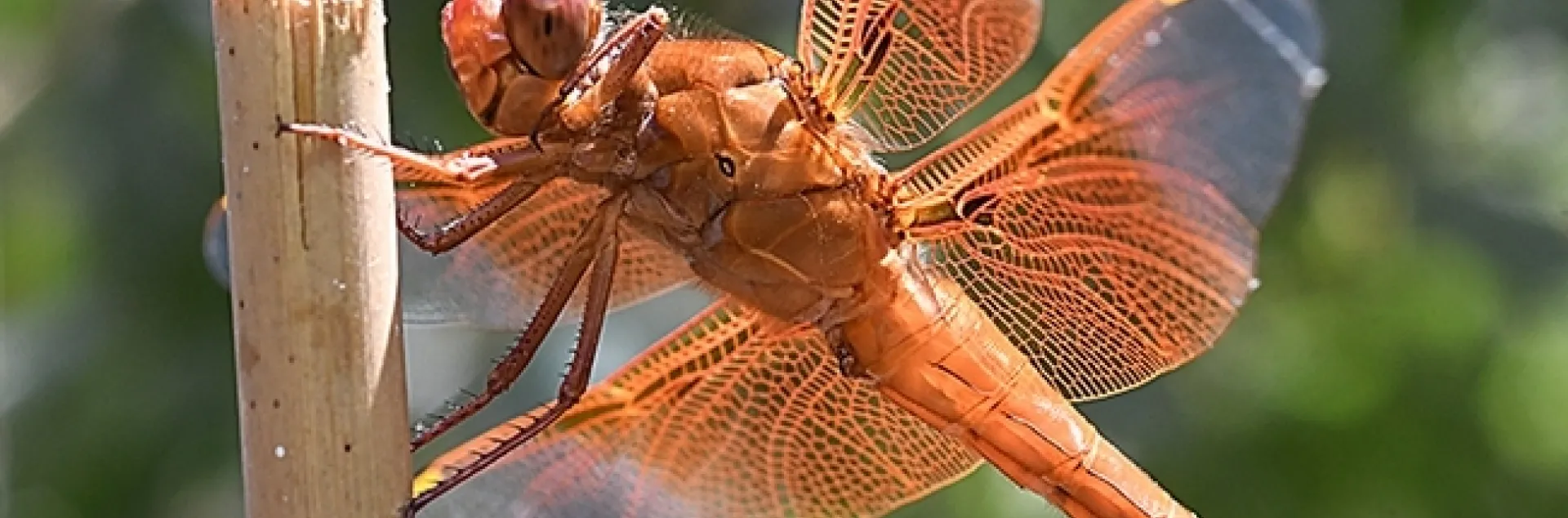 A flameskimmer dragonfly, Libellula saturata, perches on a stake in Vacaville, Calif. (Photo by Kathy Keatley Garvey)