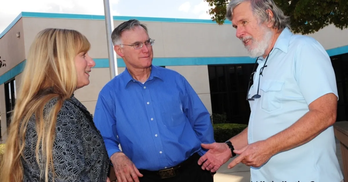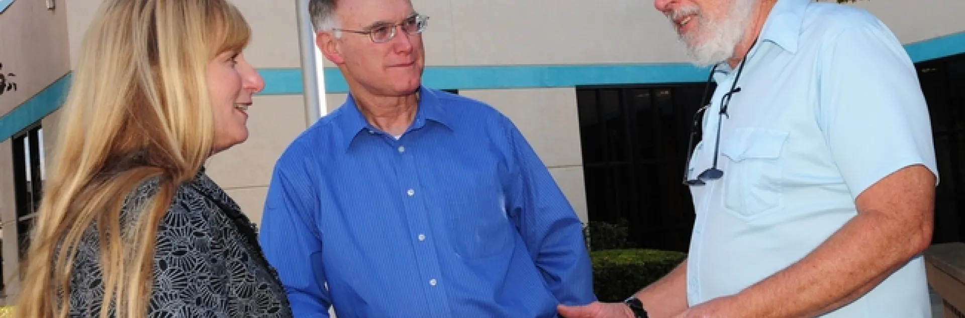 Newly elected president Robert Dowell (right) talks with UC Davis Extension apiculturist Eric Mussen and UC Davis mosquito researcher Debbie Dritz. (Photo by Kathy Keatley Garvey)